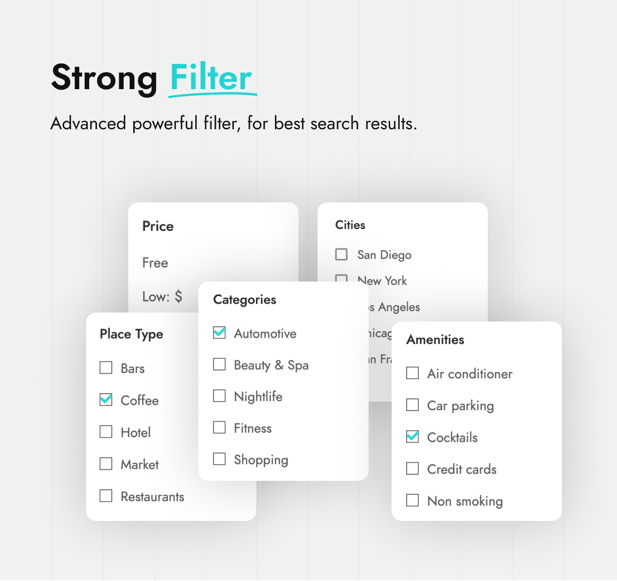 - Filter: Advanced powerful filter, for best search results. Filter listing with Type, Category, Amenities, Pricing, and Cities. The filter elements can be ordered on/off in the theme options.