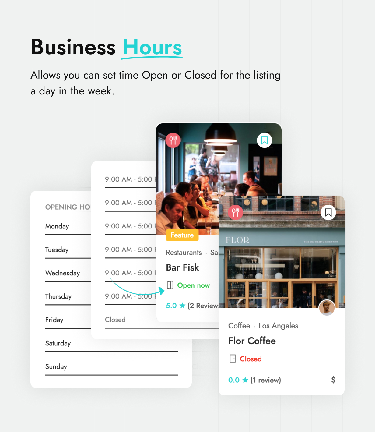 - Business Hours: Allows you can set opening hours for 24 hours or by intervals to a day in the week. EX: 8:00AM – 11:00PM; EX: 8:00AM – 12:00AM and 2:00PM – 11:00PM