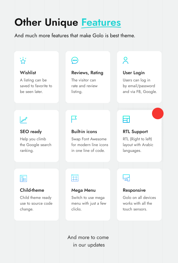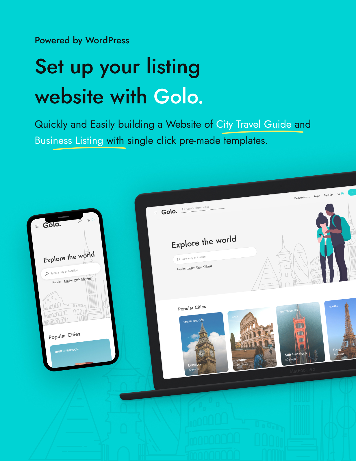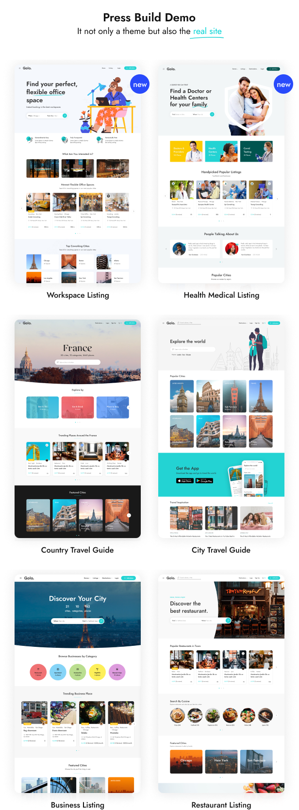 With clean UI/UX design and multiple ready-made demos, Golo helps you build websites like Yelp, Airbnb, CultureTrip, or Flydesk — without coding. Easily list restaurants, house rentals, coworking spaces, medical services, tourist attractions, and more.