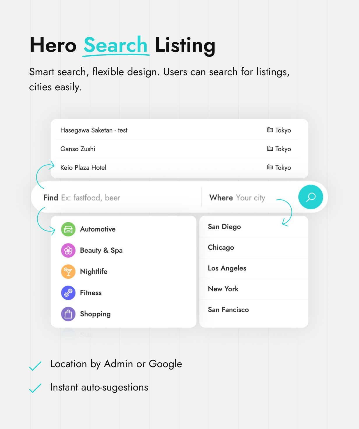 - Listing Search: Smart search, flexible design. Users can search for listings, and cities easily. There are many customized templates to choose from for your site.