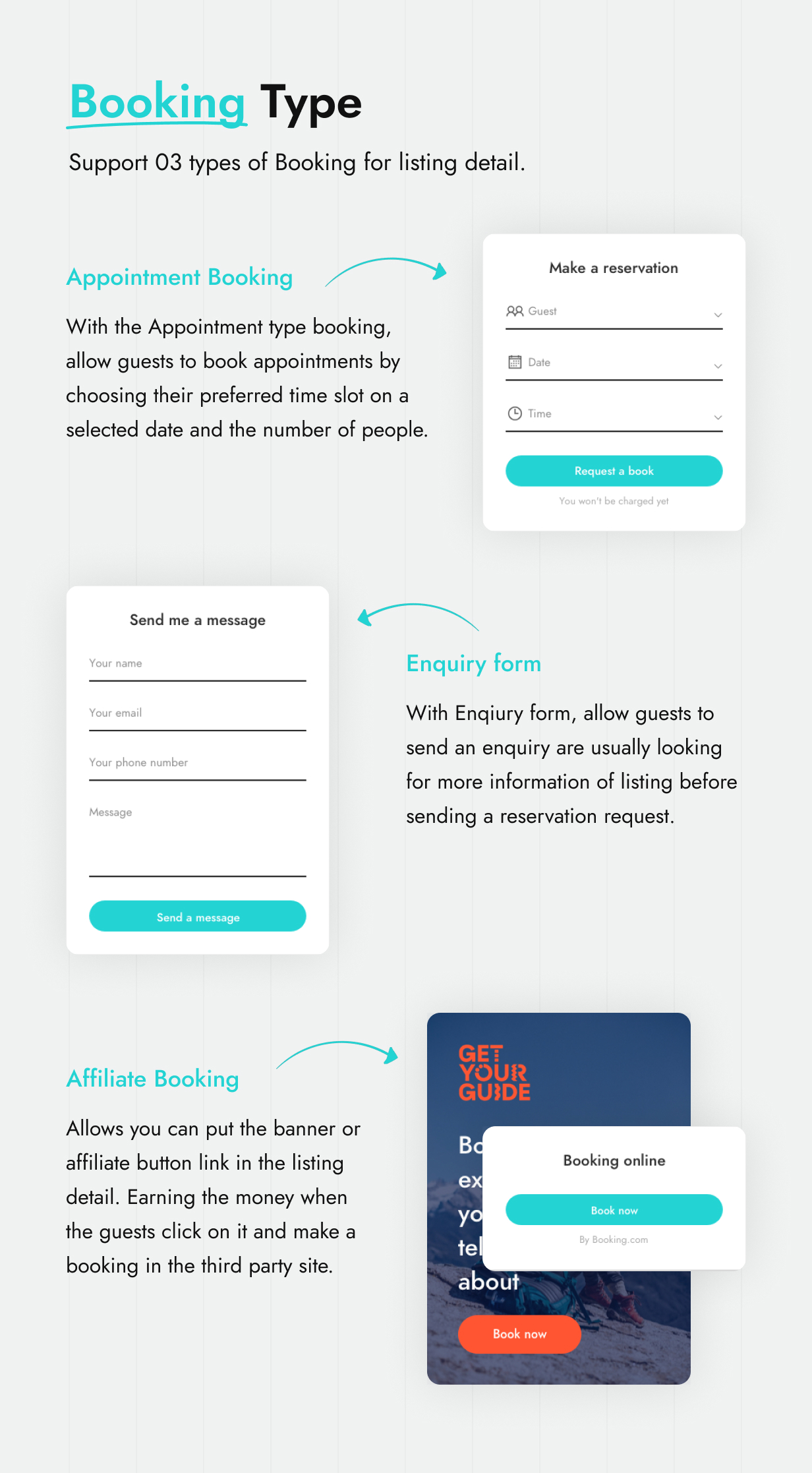 Booking Form, Send Message, See Location & Contact, Affiliate Button, Affiliate Banner