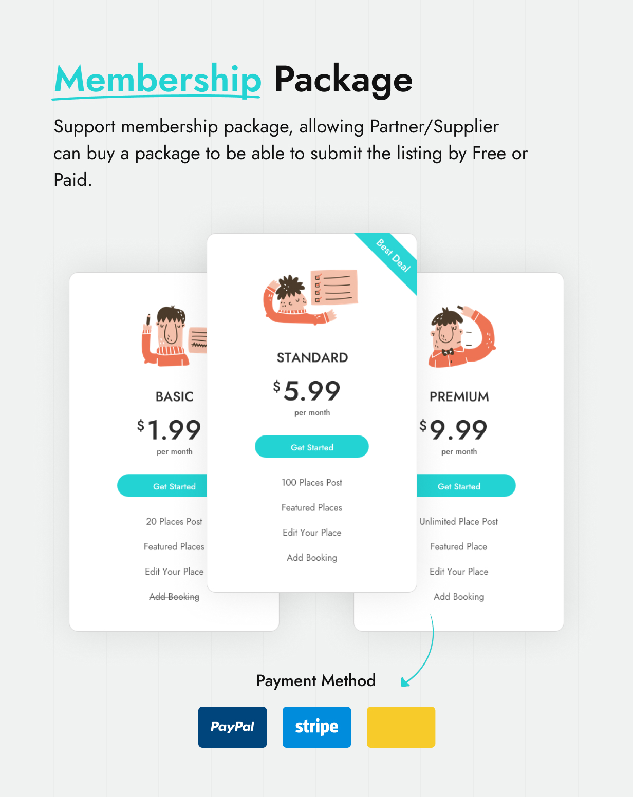 - Membership Package: Support membership package, allowing Partner/Supplier can buy a package to be able to submit the listing by Free or Paid.
