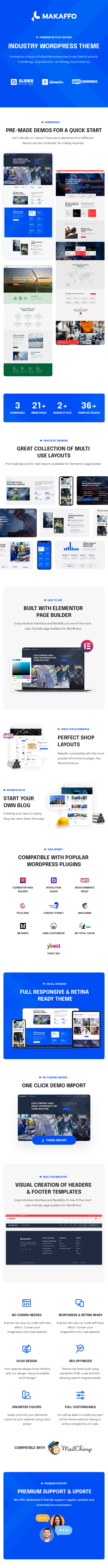 Makaffo is a business WordPress theme designed specifically for Industries, Factories, Construction, Engineering, Machinery Businesses, Commodity Businesses, Power, Rail Businesses, Airplane businesses, Ship Businesses, Oil and gas Businesses, Petroleum companies, and those that offer building services.