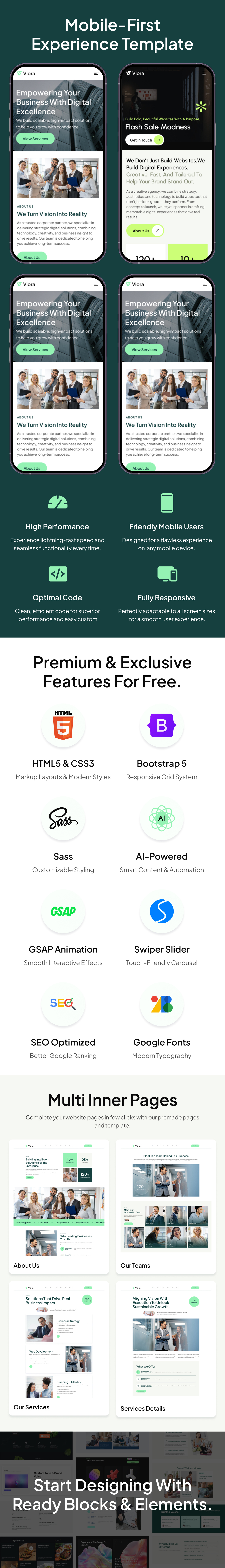 Built with HTML5, SCSS, and modern UI/UX standards, Viora delivers outstanding performance, clean code, smooth animations, and SEO optimization. Whether you’re targeting corporate, creative, medical, restaurant, technology, AI, SaaS, logistics, charity, or many other sectors — Viora has you covered.