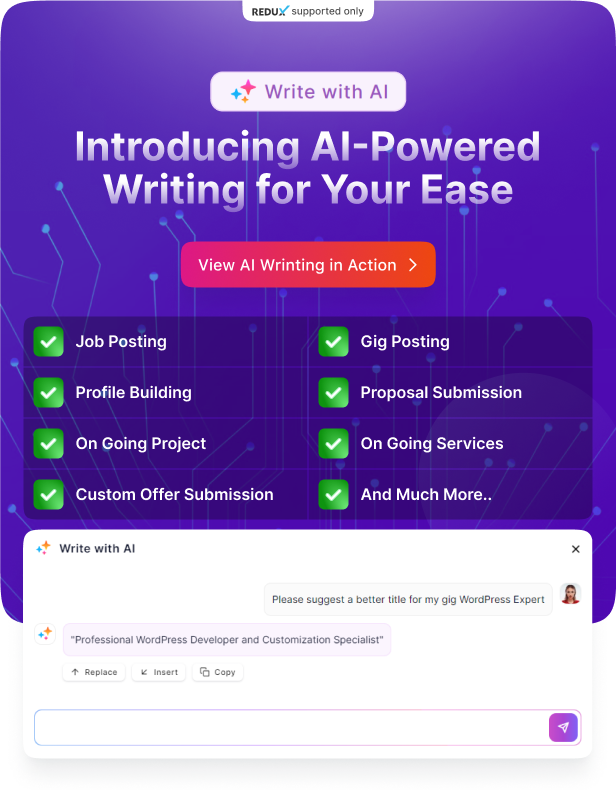 1. Updated Redux setting fields with new titles and descriptions. 2. Fixed broken profile links on the task detail page. 3. Added customization options for the 404 error page. 4. Introduced a free trial package option for freelancers and employers. 5. Added an AI feature with a package purchase option. 6. Implemented user verification requirements for task postings and proposal submissions. 7. Added a confirmation popup for completing project submissions. 8. Changed the start year in the dropdown to 2018, replacing 1970. 9. Added the option to adjust auto-close timeout settings for confirmation popups. 10. Resolved an issue with the earnings history graph in Insights. 11. Added options to make payout method fields mandatory or optional. 12. Included an option to hide payout method fields for bank payments. 13. Fixed the issue with changing placeholders in Select2. 14. Updated .pot files for plugins and addons. 15. Removed previous images when updating profile, task, and project images. 16. Added documentation on connecting OpenAI with the Workreap AI assistant.